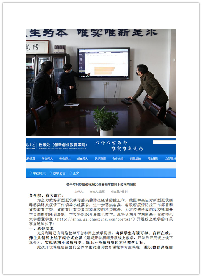 疫情严防控,学业不放松。疫情爆发后,学校第一时间发布了《关于应对疫情做好2020年春季学期线上教学的通知》,制定了线上教学实施方案,包括分阶段线上教学方案、实验课教学方案、实习工作方案、毕业论文方案等。学校利用网络平台召开2020年春季学期本科教学第一次视频会议,协调新学期本科线上教学工作。校党委书记胡朝荣现场调研了学校线上教学第一课的筹备情况,详细询问了“网课”的技术保障、功能测试、组织安排以及运行过程的重难点,对疫情防控期间和正式开学后教学工作安排提出了明确的指导意见。校党委常委、副校长陆林要求各学院要妥善安排好学院各项教学任务,全体教师要发挥主观能动性,在确保线上课程数量满足教学要求的同时,保证课程教学质量;积极做好线下教学预案,促进线上和线下教学良性互动的形成。