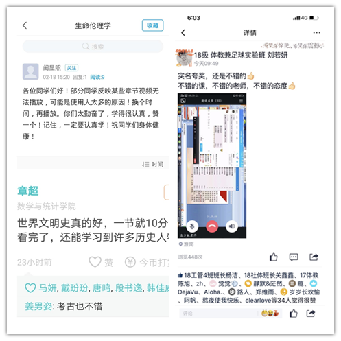 伴随着线上教学正式开启,同学们从“假期模式”一键切换到了“开学模式”。为避免上课时间冲突,师生严格遵守原定课表时间进行直播授课。对未安排线上授课的,任课教师会提前公布学习任务,并在原定课表的上课时间安排在线讨论和集中答疑等教学活动。生命科学学院的2019级陈春宇就说:“学校积极探索创新教学模式,让老师如期授课,学生如期上课,解决了师生最关心的问题。虽然隔着屏幕,但老师们的热情互动,让我们的距离被一下子拉近了。”经管学院2018级经济学的刘明禹同学就说:“学校的线上教学方式灵活,针对不同课程分别采取直播、录播等不同的方式。第一次直播教学时,我们与老师的线上课堂互动生动、可爱、有趣,把网络直播的“应援”方式应用到课堂上着实新鲜,并且效率很高;老师录播的课程可以反复观看,必要时候可以按下暂停键记录知识要点,再也不用担心自己漏记知识点了。”