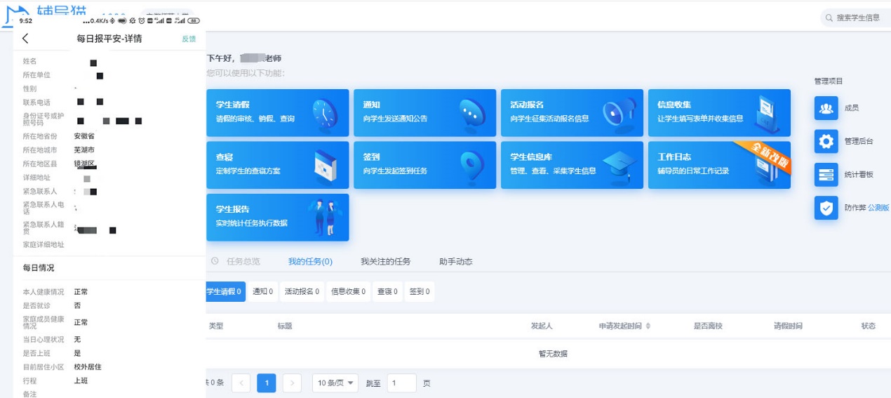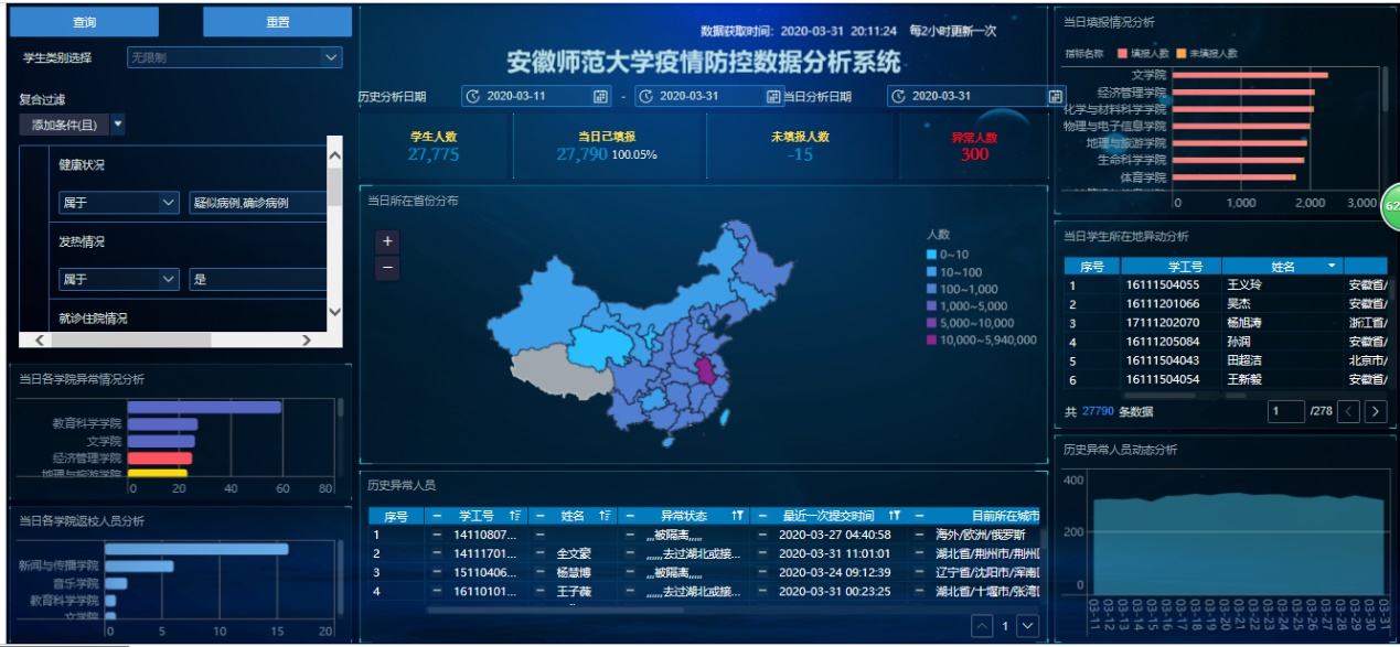 精准防疫,每日疫情全面采集。为精准掌握全部学生、全体在职教职工的实时状态和行动轨迹,信息管理中心于2月1日联系企业启动相关应用软件开发与集成工作,结合学校疫情防控办的要求和人事处、学生处、研究生院等部门的需求,加班加点进行完善,2月7日完成部署“教师疫情上报”系统和“辅导猫”学生管理系统,在学生处、研究生学院、人事处和各学院密切配合下,2月9日至12日完成师生填报培训,并实时做好技术指导和技术服务工作。师生疫情上报系统上线近2个月来,运行稳定,数据统计及时准确,有力的促进了疫情防控工作的科学决策、精准施策和快速反应,为学生返校、打赢疫情防控阻击战提供了大数据支持。