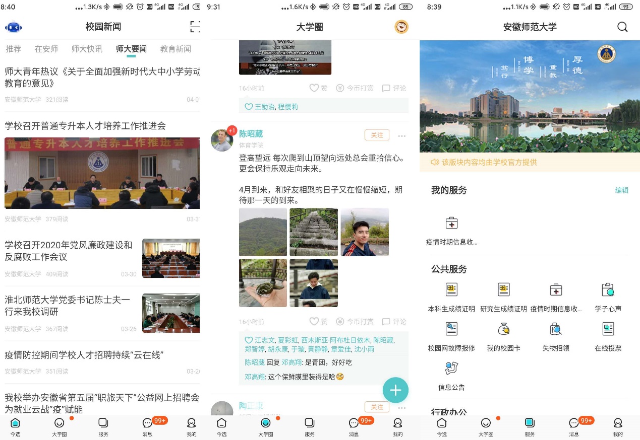 移动门户是高校信息化应用的重要移动端服务平台。该平台汇集了“校园新闻”——学校和学院新闻动态一站式了解,集成了“应用服务”——移动办公一站式窗口,形成了“大学校友圈”——及时分享师生自媒体动态等。春节期间,信息管理中心根据疫情发展预判,信息化应用将是防疫的重要工具,移动门户是重要基础。利用前期技术储备,于2月1日启动移动门户上线准备;根据学校疫情防控领导小组的要求,于2月9日正式上线学校移动门户——“今日校园”APP,到2月12日全校30000多名师生完成移动门户注册工作,为后期的各类移动应用打下坚实基础。目前接入了行政办公系统、校园卡、工资查询、校园网故障报修、学生请假、我的课表、成绩证明申请、学子心声、考试安排、信息公告等二十多个应用。通过学校统一身份认证系统监控,移动门户自上线以来访问量快速增长,已经成为仅次于网上办事大厅的重要平台,学校门户实现了PC端和移动端的闭环结合。