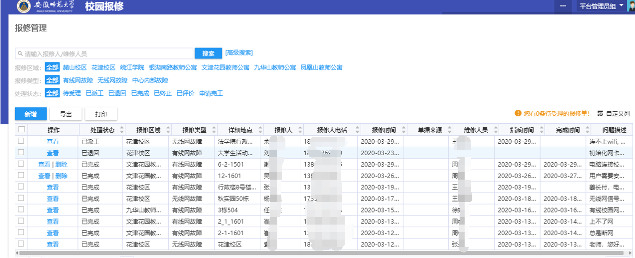 线上校园网报修,保障网络畅通。在疫情期间,为保障校园网稳定运行,一是仍坚持7*24小时值班保障制度,确保线下服务不中断;二是上线了“校园网故障报修”服务,校园网用户可以随时随地通过网上办事大厅或者“今日校园”学校移动门户实现网络报修,能在线查看报修进度,线上服务更便捷。
