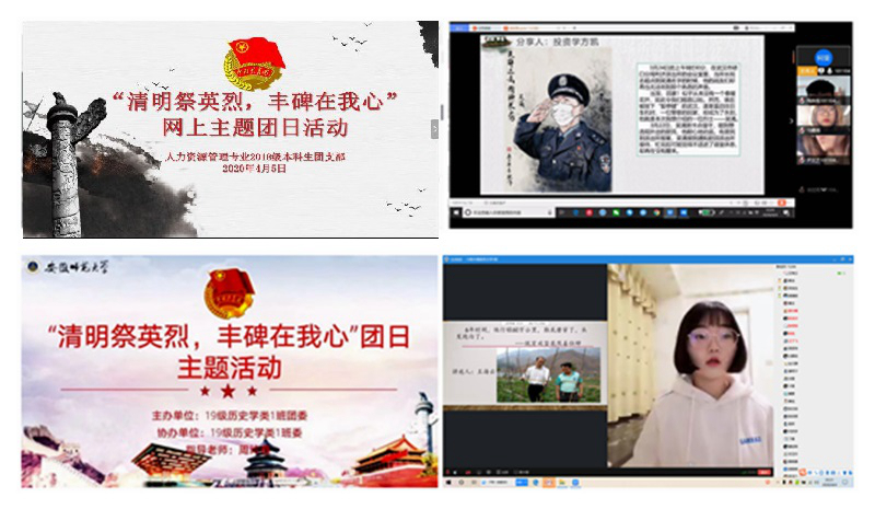 线上交流环节,团员代表围绕新冠肺炎疫情防控、决胜脱贫攻坚以及抗日战争胜利75周年等主题,与支部团员青年分享打动自己的英烈故事,支部团员也开展了线上交流讨论。2019级汉语言文学专业陈芯茹同学说:“在这个寒冬里,很多人奋勇向前,有些人的生命却永远停在了2020的春天。烈士英灵不远,我们当秉承遗志,奋斗不息。”2017级物流管理专业李德旺同学说:“我虽不能像抗疫英雄一样逆向而行,但我会为防疫贡献自己的一份力量,配合政府做好防疫工作,我相信在全国人民的共同努力下,一定能打赢这场疫情阻击战。”校团委书记梁燕也参加了所联系支部2018级人力资源管理专业团支部的主题团日活动,她在发言中用“情”“思”“行”三个关键字谈了自己的学习心得,并勉励团员青年进一步提升担当意识和责任意识,践行团员跟党走的初心和使命,在打赢疫情防控阻击战中贡献青春力量。