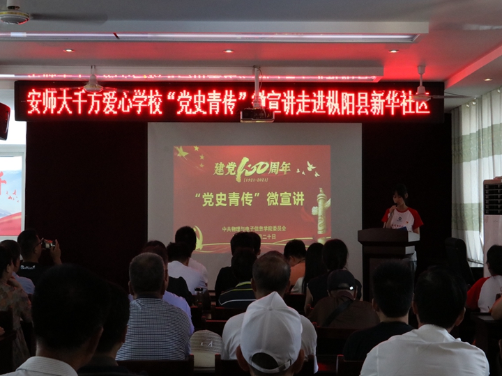 “党史青传”微宣讲,传承红色基因。为进一步推进党史学习教育,从党史“必修课”中汲取精神力量。7月20日,物电学院“党史青传”微宣讲走进枞阳县枞阳镇新华社区。宣讲团带来了题为《永不消逝的电波,永不磨灭的精神》《焦裕禄精神》《浪尖上的逆行者》《白马双枪、丛林女王——赵一曼》系列宣讲。在枞阳镇镇长方联胜,枞阳镇新华社区党委书记、居委会主任、全国优秀党务工作者张仕仪的陪同下,周新发、杨贤招等领导老师来到现场观摩。宣讲现场气氛庄重热烈,沉侵式宣讲让观众们多次流下了热泪。