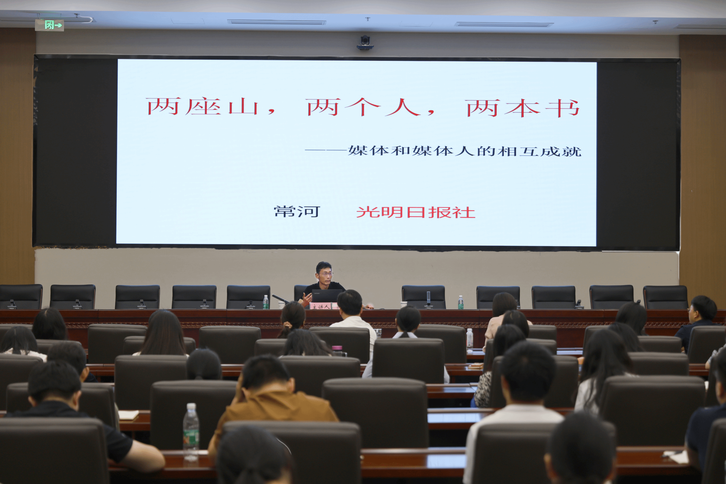 常河以《两座山,两个人,两本书——媒体和媒体人的相互成就》为题,结合自身深入基层一线采访的典型事例和典型人物,从“经典新闻案例的启示”“新闻要素的构成”“何为有价值的新闻”“媒体、记者、采访对象三者之间的关系”等方面,分享了自己多年从事新闻宣传工作的经验和感悟。讲座既有理论高度,又有实践深度,展现了一名资深记者满腔的新闻热情、严谨的工作态度和坚定的新闻追求,对做好新形势下学校新闻宣传工作具有十分重要的启示意义和指导作用。